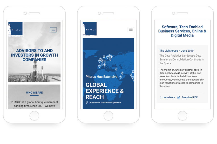 The pharus.com, PHARUS is a Global Boutique Merchant Banking Firm. i36 design to create design, develop and manage their online presence and digitally enhanced user experience.